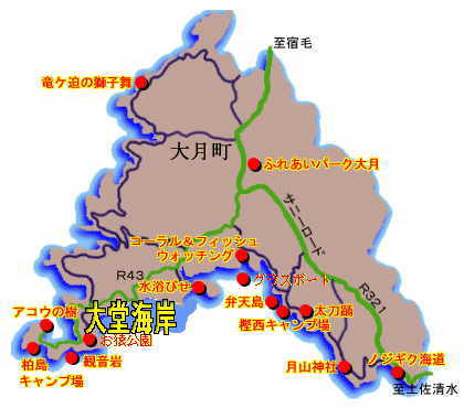 関西方面より 瀬戸大橋を渡り、高速道路を使用した場合、 高松から高松自動車道→高知自動車道に入り、終点・伊野インターチェンジで降りて下さい。この間約1時間30分。 次に伊野から国道56号に入り、須崎・中村・宿毛方面に向かって下さい。 国道56号に入って、約3時間で宿毛に着きます。 松山・広島・山口方面より 松山から国道56号線に入り、大洲・宇和島・宿毛方面に向かって下さい。 宇和島まで約2時間30分。さらに宿毛まで約1時間30分。 九州方面より 佐伯港からフェリーで宿毛まで2時間30分。 宿毛市から 国道321号(サニーロード)を大月町・土佐清水市(足摺岬) 方面に向かって下さい。20分程で大月町の中心地に着き、さらに1.5qほど走ると柏島・大堂海岸方面の大きな案内標識がありますので、その交差点(信号:大月町ニツ石)を右折して県道43号線に入って下さい。右折して2車線道路を数キロ(5分ほど)走ると、左手に出光のGSがあり、そこから20m先の左手に「安岡渡船」の看板が見えます。【詳細地図】 |